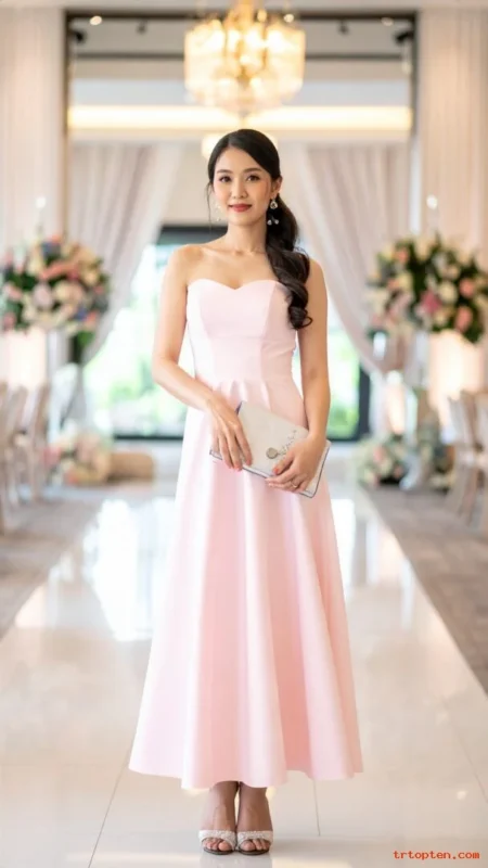 This dress works well for cocktail dress codes. It suits rooftop venues and modern ballrooms. Add a light trench coat for travel and photos outside.