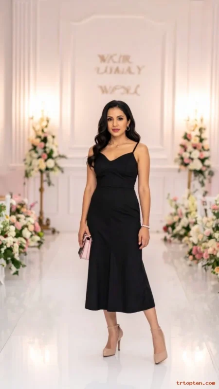 Black can work in April if you style it lightly. Choose breathable fabric and add spring-toned accessories. A midi length and soft neckline keep it wedding-appropriate.
