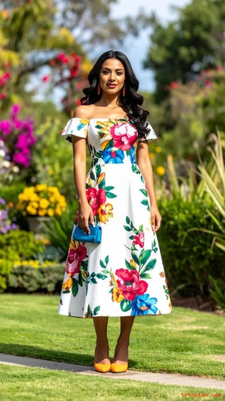 A white base can work if the print is bold and the outfit does not read bridal. Add colored shoes and a colored bag to shift focus. If you feel unsure, choose a dress with a colored base instead.