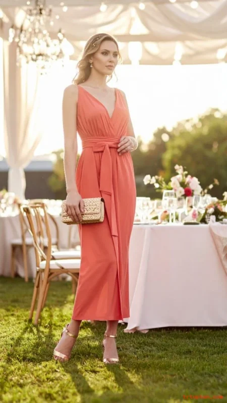 Coral brings energy and warmth to a spring wedding outfit. The wrap shape feels comfortable and adjustable. A midi hem keeps it polished and venue-friendly.