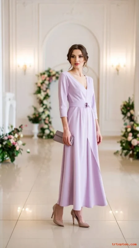 This dress works well for church weddings and formal venues. The sleeve coverage also helps in cooler climates. Mauve pairs nicely with silver or champagne accessories.