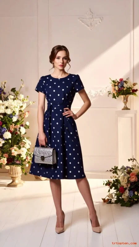 Polka dots look great in photos without overpowering the scene. Navy also fits evening events and indoor weddings. This dress works for cocktail and semi-formal settings.