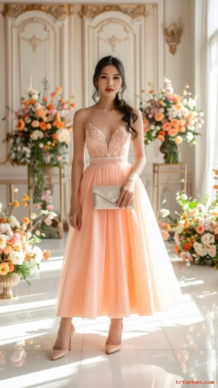 Peach feels soft and sunny, perfect for April. An A-line shape gives comfort and a neat silhouette. Midi length keeps it suitable for most venues.