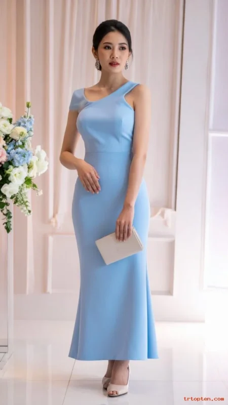 A one-shoulder dress adds a modern twist without looking loud. Sky blue feels crisp and season-friendly for April. Keep the hem around the knee or midi for a wedding-safe length.