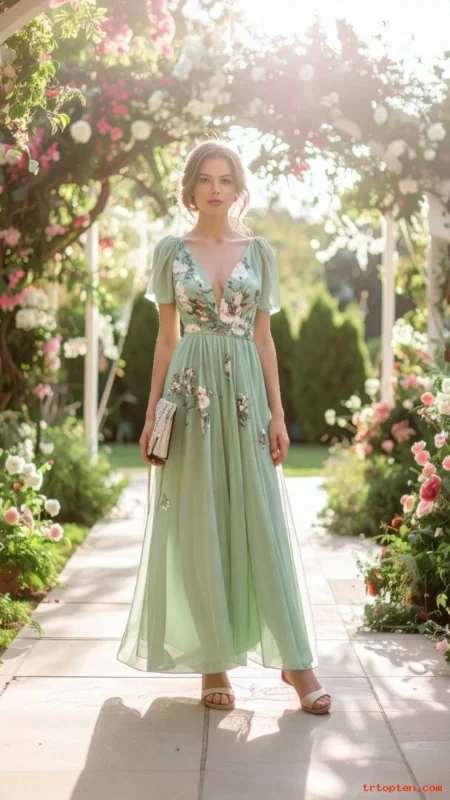 Soft green florals feel natural and spring-ready. A V-neckline frames the face and works well with simple jewelry. A maxi skirt adds elegance for April ceremonies.