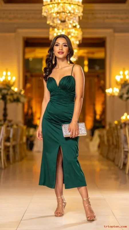 Emerald brings rich color that still feels elegant in spring. Ruching adds texture and flatters the waist and hips. A midi hem keeps the look refined for weddings.