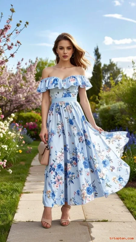 Tea-length dresses feel vintage and charming. A spring print keeps it seasonal and fresh. The hem hits between knee and ankle for a playful but polished look.