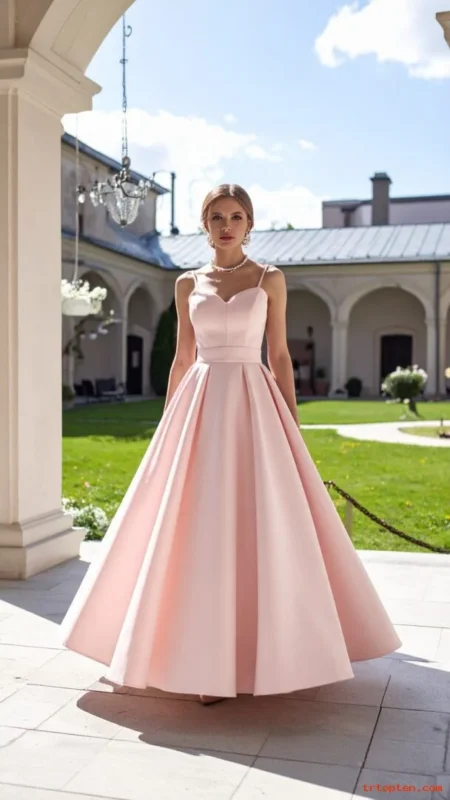 A halter neckline feels sleek and modern. Powder pink keeps it soft and spring-ready. Choose a midi or maxi length based on the dress code.
