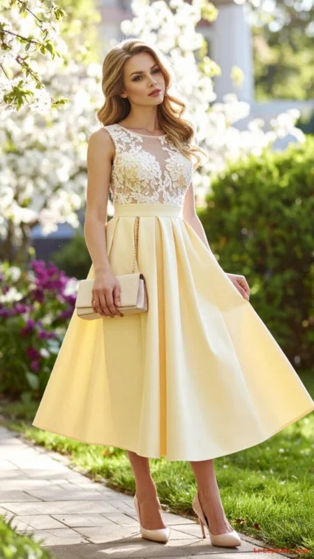 Buttercream yellow feels sunny and sweet for April weddings. It looks bright without feeling neon. Choose a midi length to keep it classy and balanced.