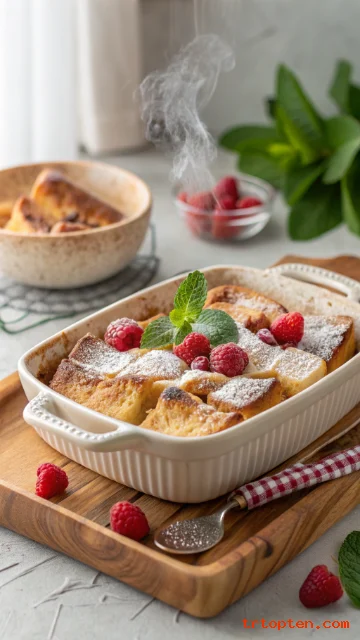 This dish is both crowd-pleasing and beautifully practical for a host. It uses simple ingredients like bread, eggs, milk, and cinnamon. You can add cream cheese, berries, or nuts for extra flavor. It bakes into a golden, pudding-like consistency that feels indulgent.