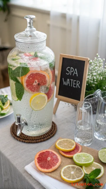 A spa water station offers a refreshing and elegant non-alcoholic drink. Use a large glass drink dispenser for a beautiful centerpiece effect. Fill it with cold, filtered water and plenty of ice. This becomes a hydrating focal point for the party.