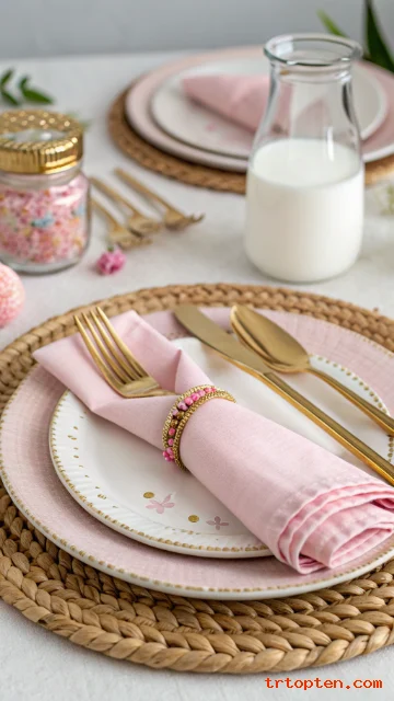 Add personality with cloth napkins, colored glassware, and pretty flatware. Choose napkins in your theme’s color, like a soft pink for a girl’s shower. Gold-toned cutlery or vintage glassware adds a touch of elegance. Small details create a cohesive and intentional tablescape.