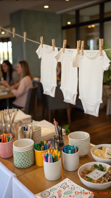 A onesie decorating station is a creative and practical activity. Provide plain white onesies in various sizes, fabric markers, and stencils. Set up a protected table where guests can design their own creations. This gives guests a chance to make a personal gift for the baby.