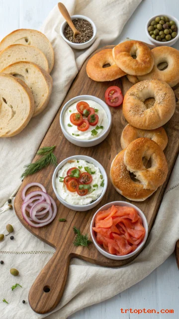 Add luxurious toppings to elevate the simple bagel. Include thin slices of smoked salmon (lox), capers, red onion, and fresh tomato. Don’t forget lemon wedges and fresh dill for the perfect finishing touches. Arrange everything on large platters or boards for a generous, inviting display.