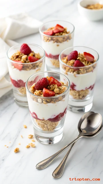 Individual yogurt parfaits are a healthy, pretty, and easy-to-serve option. Layer Greek yogurt with granola and fresh berries in clear glasses. You can prepare these parfaits a few hours before the party and keep them chilled. They add a lovely vertical element to your brunch table.