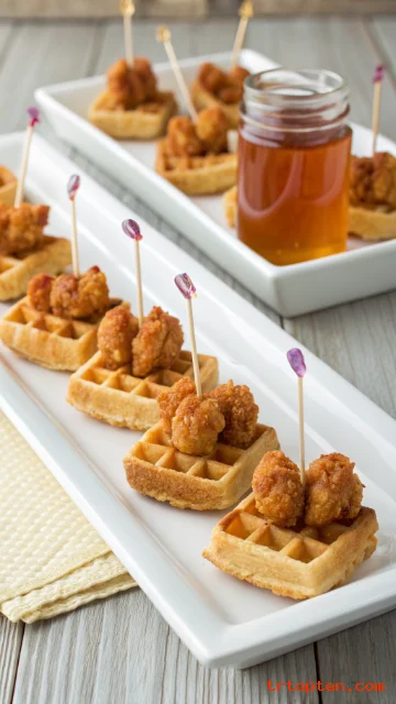 Mini chicken and waffle bites are a playful, savory-sweet crowd-pleaser. Use store-bought mini waffles or a mini waffle maker for the perfect base. Top each warm waffle with a piece of crispy chicken, like a popcorn chicken piece or a small nugget. Skewer them together with a decorative pick for easy serving.