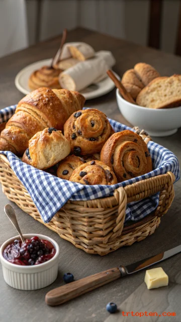This basket provides effortless elegance and variety. You can bake these items yourself if you enjoy it, or support a local bakery. Warm the pastries slightly before serving to maximize their aroma and flavor. Provide small plates, knives, and jams for a complete experience.