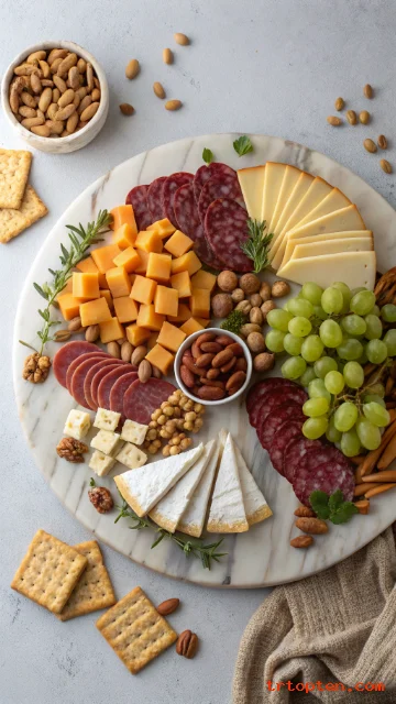 Build out the board with complementary textures and tastes. Include nuts, dried fruits, olives, and cornichons. Add crackers, breadsticks, and sliced baguette for serving. Arrange everything with space between items for a visually appealing, artful look.