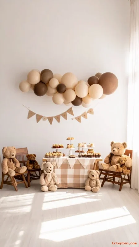 Use soft browns, creams, and honey tones to set a cozy mood that fits any season. Add plush teddy bears on chairs and tables to make the space feel warm and playful.