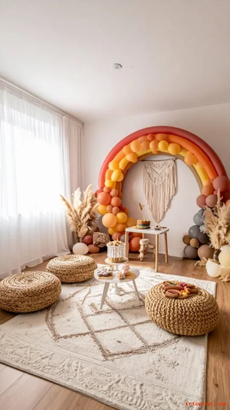 Create a cozy lounge corner with floor cushions for gifts and chats. Add rainbow-shaped cookies and a neutral balloon arch behind the dessert table.
