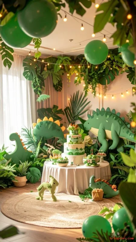 Use green, brown, and orange for a playful prehistoric look. Add dinosaur cutouts and leaf garlands to create depth.