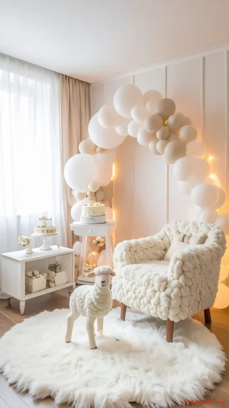 Create a lullaby playlist and a cozy photo corner with a plush lamb seat. Give guests small candle favors in soft neutral tones.