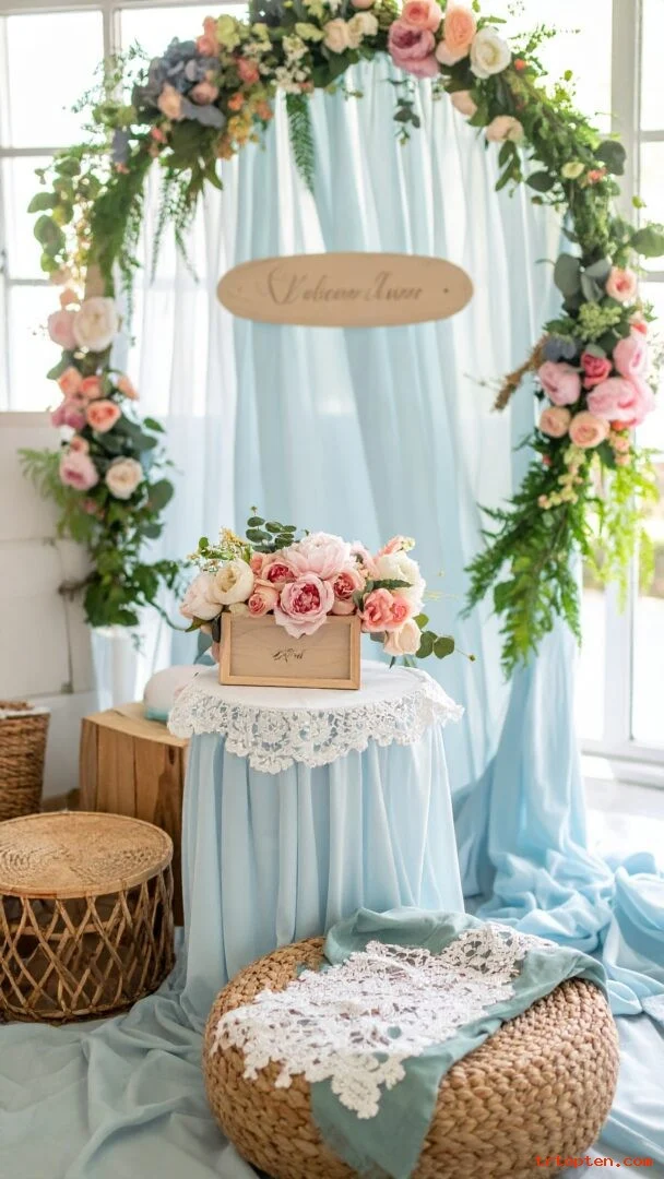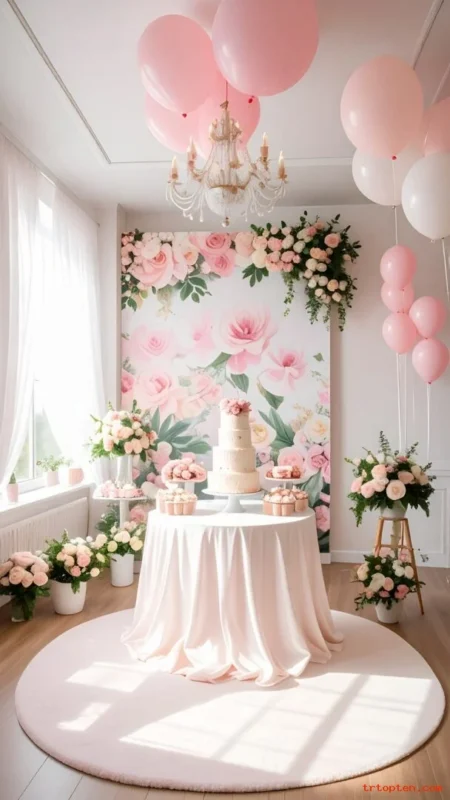 Use florals in blush, peach, and white for a soft garden vibe. Add fresh blooms on tables and a flower wall behind the dessert table.