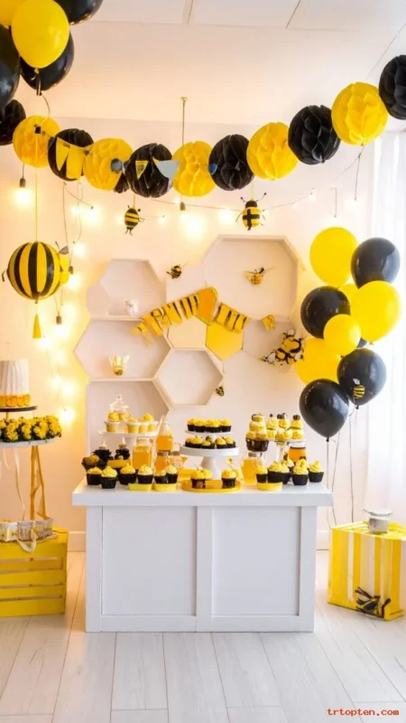 Use yellow, black, and white with honeycomb patterns for quick impact. Add small jars of honey as decor and favors in one.