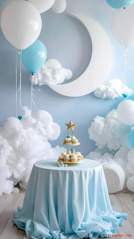 Pick soft white, gray, and pale blue for a calm sky look. Hang paper clouds and add a crescent moon backdrop for photos.