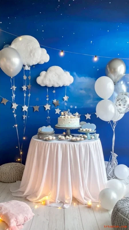 Serve cloud-shaped cookies and a simple cake with moon details. Use fluffy cotton-like decor on the dessert table for texture.