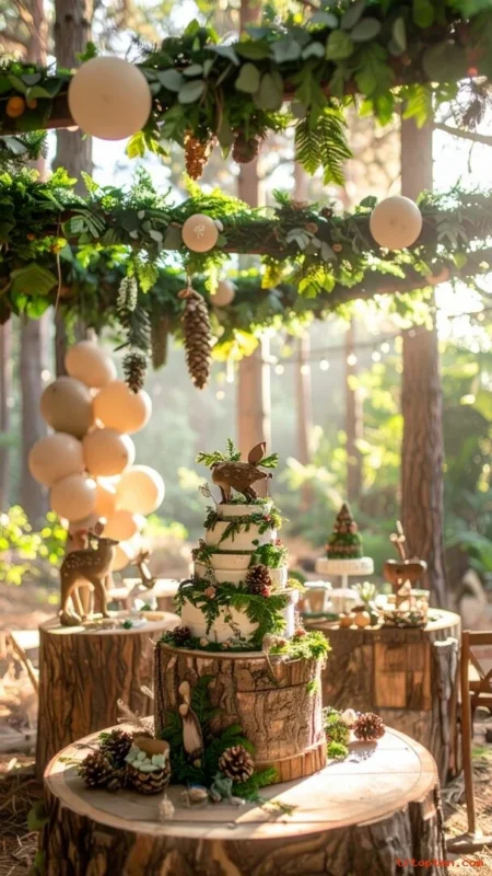 Use sage green, brown, and cream to create a calm forest vibe. Add pinecones, faux greenery, and little animal figures on the tables.