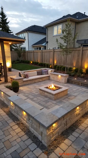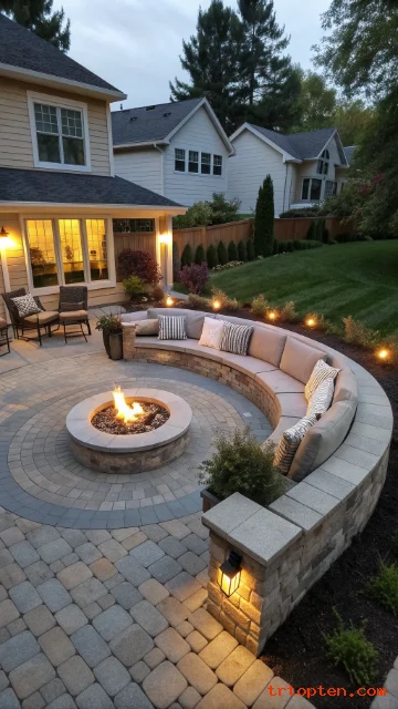 Use a circular seating layout so everyone faces the fire. Pick heat-safe pavers or concrete around the pit.