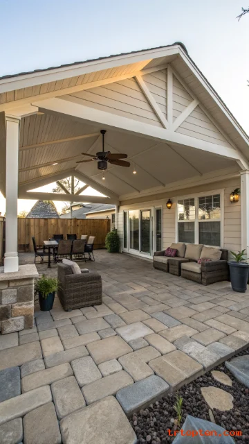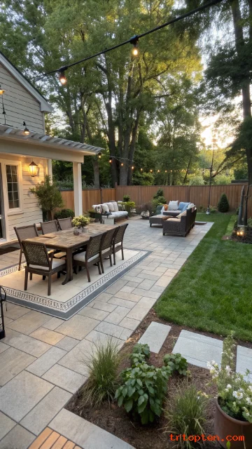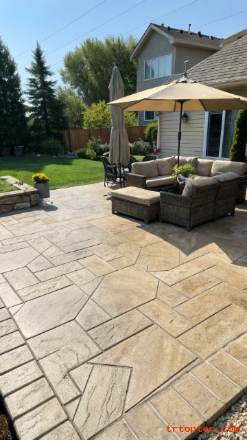 Stamped concrete gives a high-end look with less upkeep. It works well for larger patios.