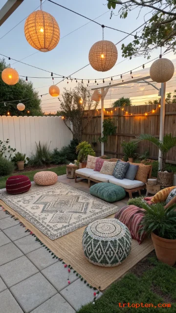 Add a large outdoor rug, poufs, and woven lanterns. Use warm neutrals with a few earthy color pops.