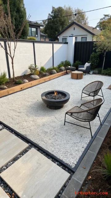 Use compacted base layers so chairs feel stable. Add a fire bowl to anchor the seating area.