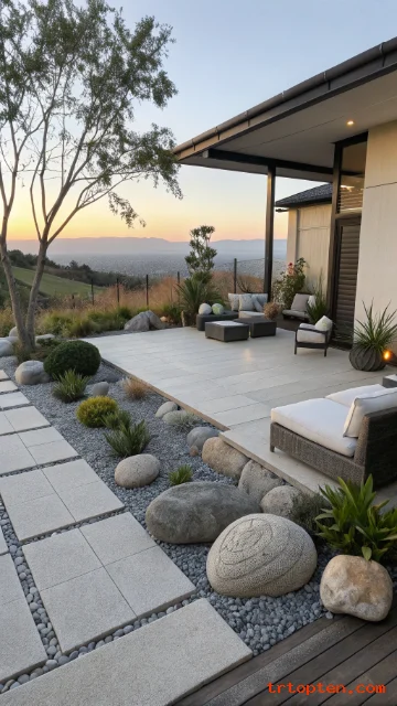 Use raked gravel, a few large stones, and simple plants. Keep decor minimal for a clean finish.
