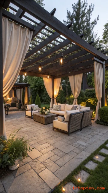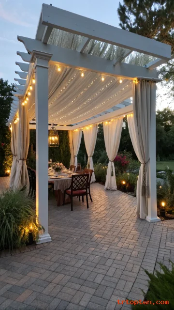 A pergola adds structure and light shade. String lights make the space feel festive at night.