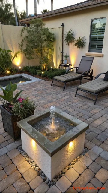 Place the water feature near seating but not in the walkway. Use uplights to highlight the water at night.