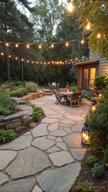 Place stones with wider gaps and fill the joints with pea gravel. Add lantern lighting for a soft evening glow.
