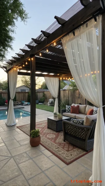 Use neutral curtains that resist mildew. Add a ceiling fan if the pergola supports it. Place seating to face the pool for a relaxed view.