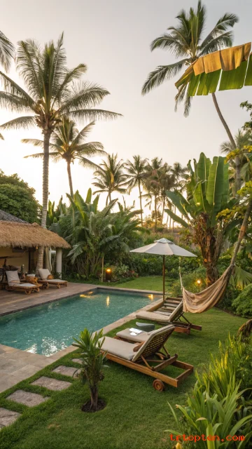 Use layered plants: tall palms, mid-height shrubs, low ground cover. Add a gravel border for drainage and a tidy look. Place a hammock or swing chair for a resort vibe.