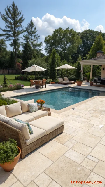 Pick weatherproof furniture in neutral tones to match the stone. Add two or three terracotta pots for warmth. Keep pool coping in the same stone for a seamless edge.