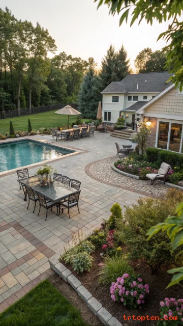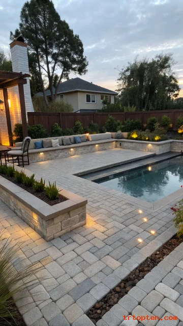 Use pale pavers or sand-toned stone. Add blue cushions, umbrellas, or planters for color. Keep decor simple and breezy.