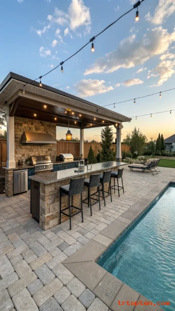Create a clear path from pool to bar with non-slip pavers. Add task lighting under counter edges. Store towels and sunscreen in a nearby cabinet.