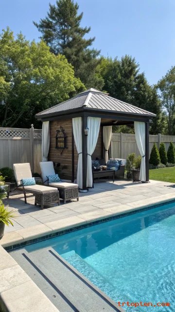 Include hooks, shelves, and a bench inside. Use outdoor-rated curtains or sliding panels. Place the cabana near the shallow end for easy access.
