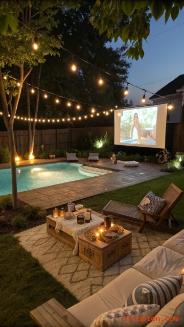 Outdoor movies make the pool area feel like a destination. A simple screen and projector create big fun. Add comfy seating so guests stay longer.