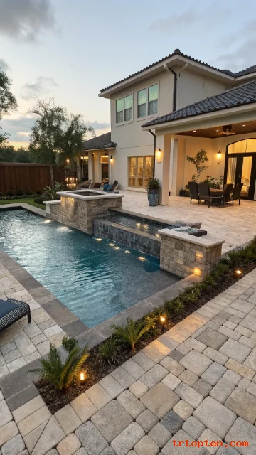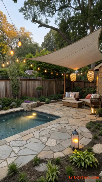 Mix stones in similar tones to avoid visual noise. Use curved planting beds to echo the pool line. Add a small waterfall feature for gentle sound.