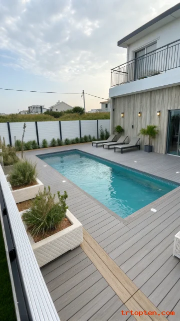 A wood deck feels warm and inviting. It pairs well with modern or coastal styles. It also gives a smooth transition from house to pool.