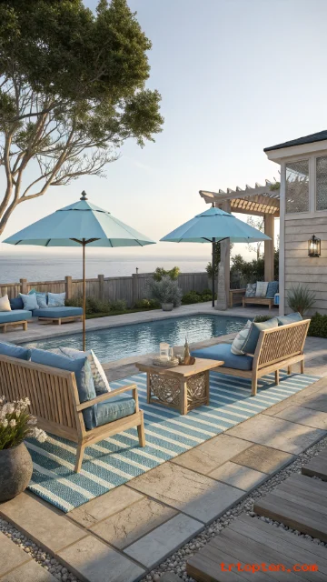 Add a striped outdoor rug for a classic touch. Use rope or woven details in lighting. Include a small outdoor shower for beach energy.