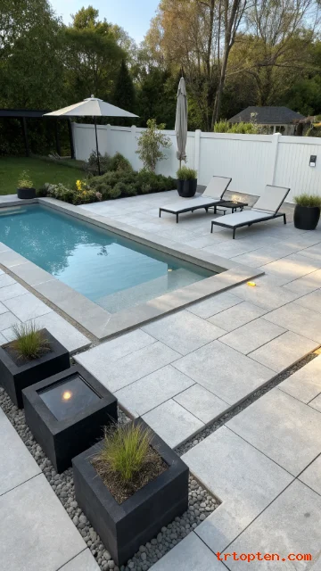 Use a light grout color to keep the patio bright. Add a simple pergola or umbrella for shade near seating. Place a towel station close to the pool entry.